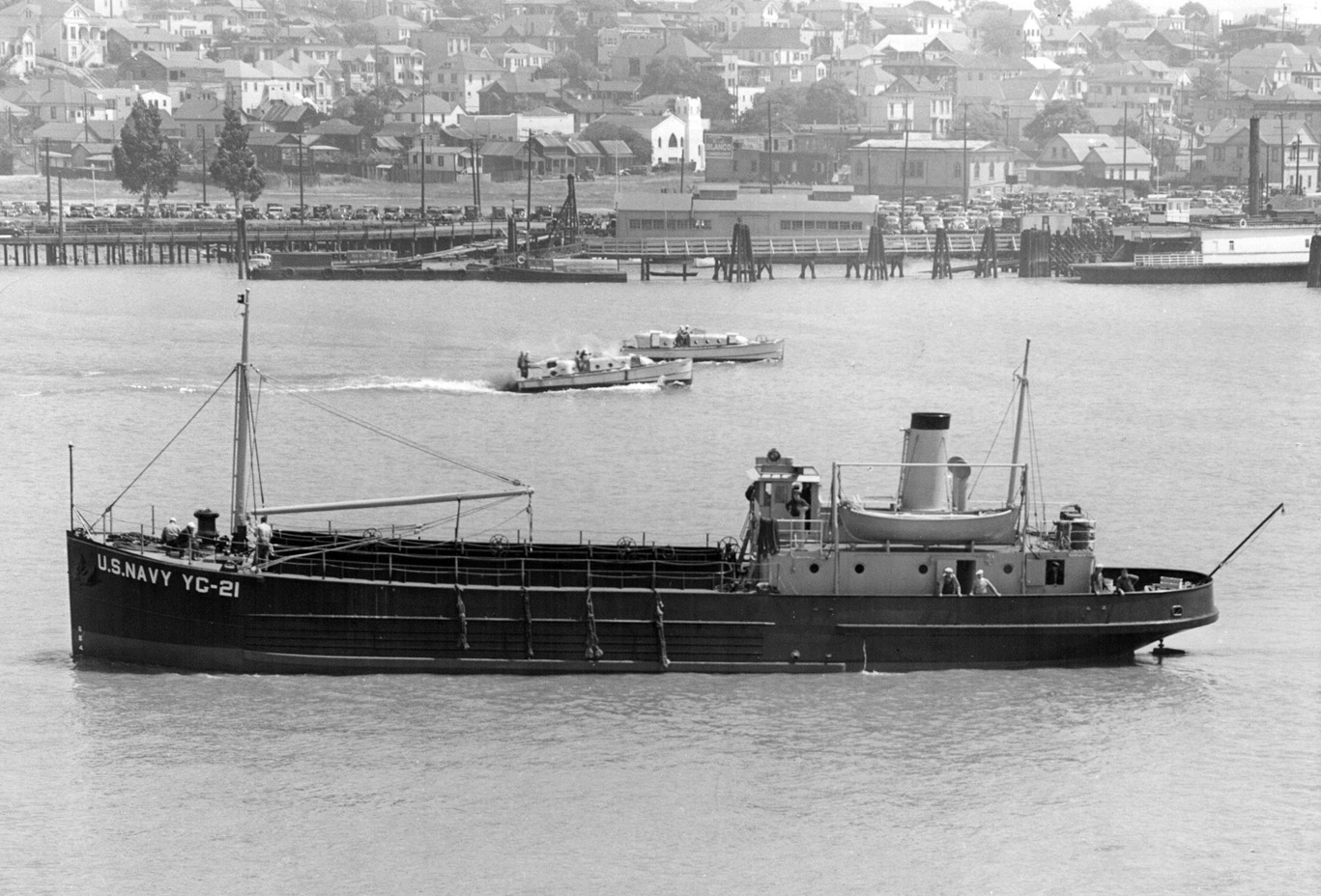 YF-270 departing Pacific Dry Dock & Repair, Oakland, where she had been completed on 19 September 1941.