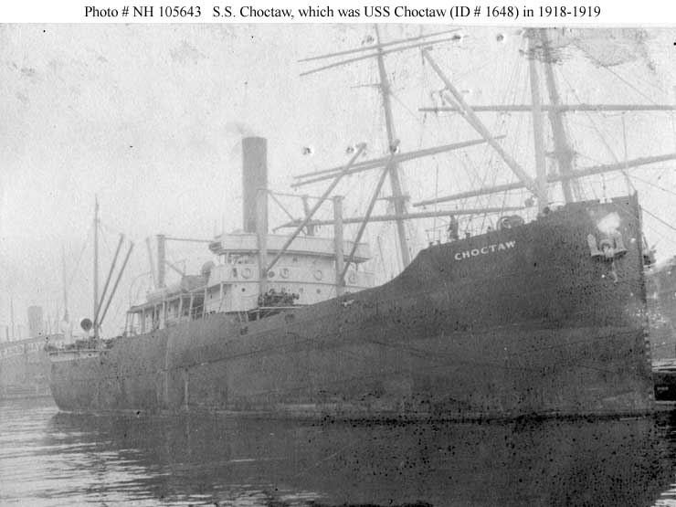 Choctaw, a 2081 gross ton freighter, was built at Chicago, Illinois, in 1917. In February 1918, when she was owned by the Clyde Steamship Company of New York City, the ship was turned over to the Navy. Commissioned in early March as USS Choctaw (ID # 1648), she was assigned to the Naval Overseas Transportation Service and, during the rest of the year, made four voyages across the Atlantic to European waters. In addition to general cargo, she transported mines for the great anti-submarine mine barrage that was laid across the North Sea during the last months of World War I.
