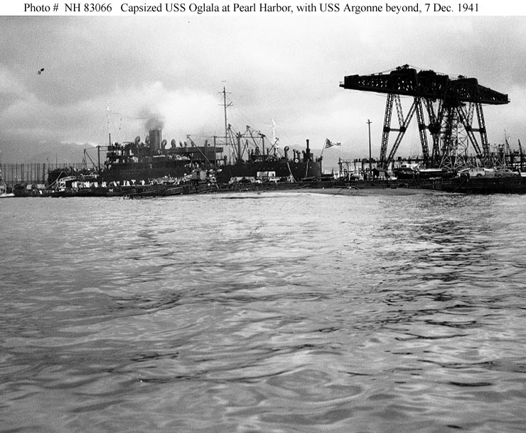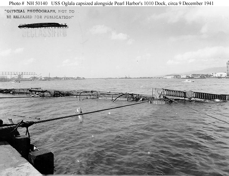 When it became clear that she might sink, Oglala was moved aft of Helena, so she would not pin the warship against the dock. About two hours after receiving her initial damage, she rolled over to port and sank beside 1010 dock. There Oglala became the object of a prolonged, and ultimately successful salvage effort.