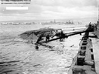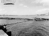 Photo #: NH 50140 USS Oglala (CM-4) View taken from 1010 Dock, showing the capsized ship's starboard deck edge and embarkation ladder, 9 December 1941, two days after she was sunk in the Japanese attack on Pearl Harbor. In the center distance is the beached and sunken battleship Nevada (BB-36). USS Shaw (DD-373), wrecked in the floating drydock YFD-2, is in the left center distance. Ford Island Naval Air Station is at right. Photograph was taken by Pearl Harbor Navy Yard. Official U.S. Navy Photograph, from the collections of the Historical Center. Online Image: 73KB; 740 x 570 pixels |