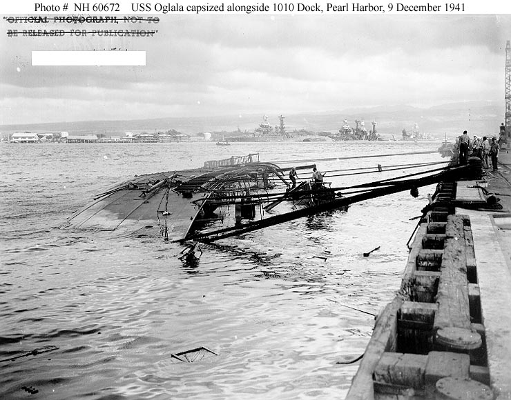 Photo #: NH 60672 USS Oglala (CM-4) Capsized alongside 1010 dock at Pearl Harbor, 9 December 1941. She was sunk during the Japanese air raid two days earlier. Preliminary salvage work on her is already underway "Battleship Row", by Ford Island is in the distance, with USS Maryland (BB-46) in center, alongside the capsized USS Oklahoma (BB-37). Astern are USS West Virginia (BB-48), sunk alongside USS Tennessee (BB-44). Farthest to the right are the sunken and burned-out remains of USS Arizona (BB-39). Official U.S. Navy Photograph, from the collections of the Historical Center. Online Image: 105KB; 740 x 580 pixels |