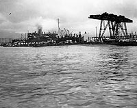 Photo #: 80-G-474789 Pearl Harbor Attack, 7 December 1941 View from Pier 1010, looking toward the Pearl Harbor Navy Yard's drydocks, with USS Shaw (DD-373) -- in floating drydock YFD-2 -- and USS Nevada (BB-36) burning at right, 7 December 1941. In the foreground is the capsized USS Oglala (CM-4), with USS Helena (CL-50) further down the pier, at left. Beyond Helena is Drydock Number One, with USS Pennsylvania (BB-38) and the burning destroyers Cassin (DD-372) and Downes (DD-375). Official U.S. Navy Photograph, now in the collections of the National Archives. Online Image: 119KB; 740 x 610 pixels Reproductions of this image may also be available through the National Archives photographic reproduction system. |
