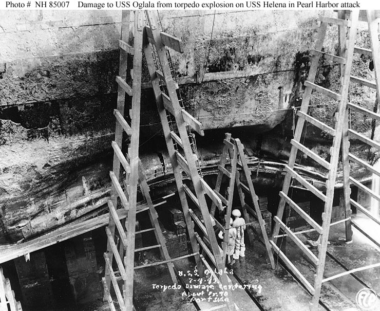 On the morning of 7 December 1941 USS Oglala, flagship of the Pacific Fleet Mine Force, was tied up outboard of the light cruiser Helena (CL-50). They were alongside Pier 1010 at the Pearl Harbor Navy Yard, with an eight-foot camel between them. Japanese torpedo planes of the first attack wave hit the cruiser with a single torpedo, which ran under Oglala to hit Helena's starboard side. The torpedo's explosion broke through the minelayer's port bilge amidships, and she rapidly took on water. A bomb that burst nearby caused further damage. With the marginal watertight integrity typical of older ships, Oglala's flooding could not be contained.