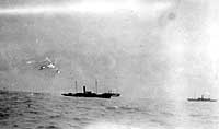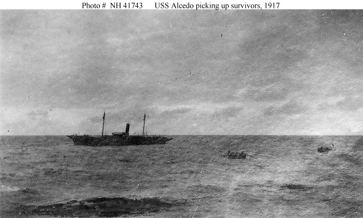 Photo #: NH 41745 USS Alcedo (SP-166), left center, and USS Wakiva II (SP-160), at right Picking up survivors in 1917. This photograph was probably taken on 28 October 1917, when these two converted yachts picked up men who had left the torpedoed transport Finland. The two-stacked ship in the center distance, beyond Alcedo's bow, appears to have four masts and is probably Finland, which survived the incident and later served as USS Finland (ID # 4543). USS Alcedo was torpedoed and sunk on 5 November 1917. Courtesy of Mr. W.D. Porter, November 1937. U.S. Naval History and Heritage Command Photograph. Online Image: 43KB; 740 x 460 pixels |