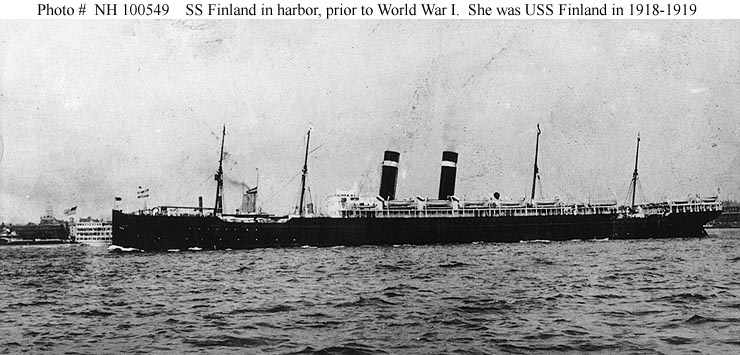 Photo #: NH 100549 SS Finland (American Passenger Steamship, 1902) Underway in a U.S. harbor, prior to World War I. After service as an Army-chartered transport in 1917, this ship was acquired by the Navy on 24 April 1918 and placed in commission as USS Finland two days later. She was decommissioned and returned to the Army on 15 November 1919. At some point during or shortly after her Navy service she was assigned the registry ID # 4543. U.S. Naval History and Heritage Command Photograph. Online Image: 73KB; 740 x 355 pixels |