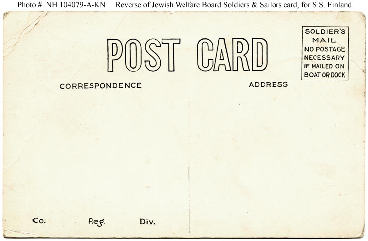 Photo #: NH 104079-A-KN (color) Jewish Welfare Board Soldiers & Sailors Post Card Reverse side of a card issued to U.S. servicemen during the World War I era. Its front side, seen in Photo # NH 104079-KN, features a view of S.S. Finland, which served as USS Finland (ID # 4543) in 1918-1919. Donation of Dr. Mark Kulikowski, 2006. U.S. Naval History and Heritage Command Photograph. Online Image: 42KB; 740 x 485 pixels |
