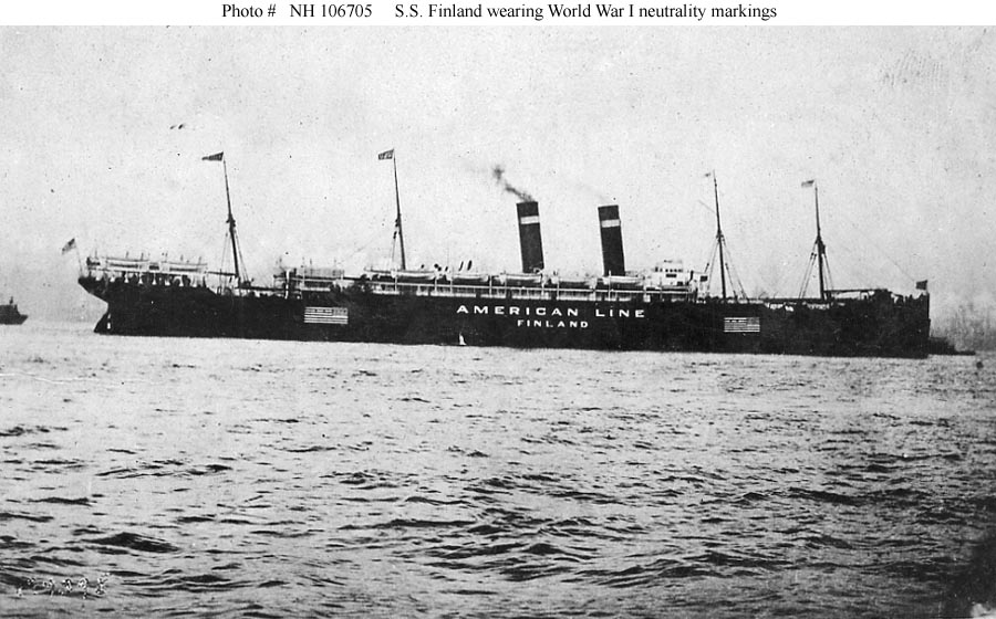 Photo #: NH 106705 S.S. Finland (American Passenger Liner, 1902) Wearing World War I neutrality markings, circa 1914-1917. This ship served as USS Finland (ID # 4543) in 1918-1919. The original image is printed on post card stock. Donation of Charles R. Haberlein Jr., 2009. U.S. Naval History and Heritage Command Photograph. Online Image: 109KB; 900 x 560 pixels |