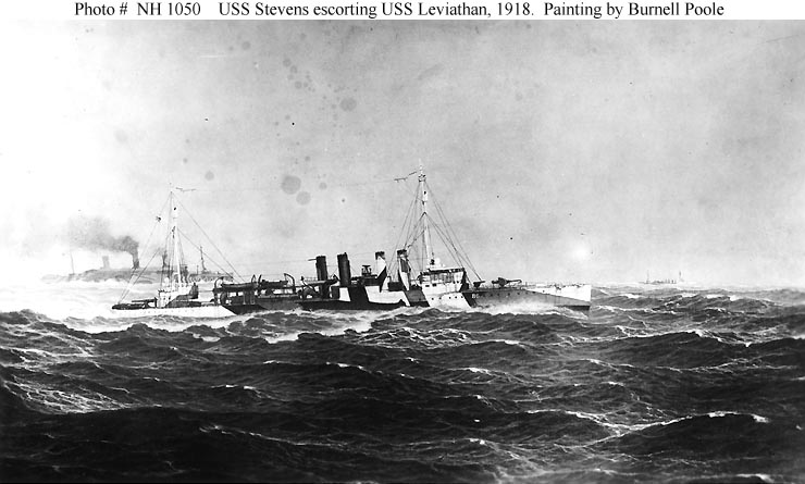 Photo #: NH 1050 USS Stevens (Destroyer # 86) Painting by Burnell Poole, 1924, depicting Stevens escorting USS Leviathan (ID # 1326) in the Atlantic, 1918. Another destroyer is in the right distance. This photograph was taken circa the 1920s or 1930s. U.S. Naval Historical Center Photograph. Online Image: 64KB; 740 x 445 pixels |