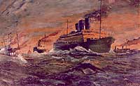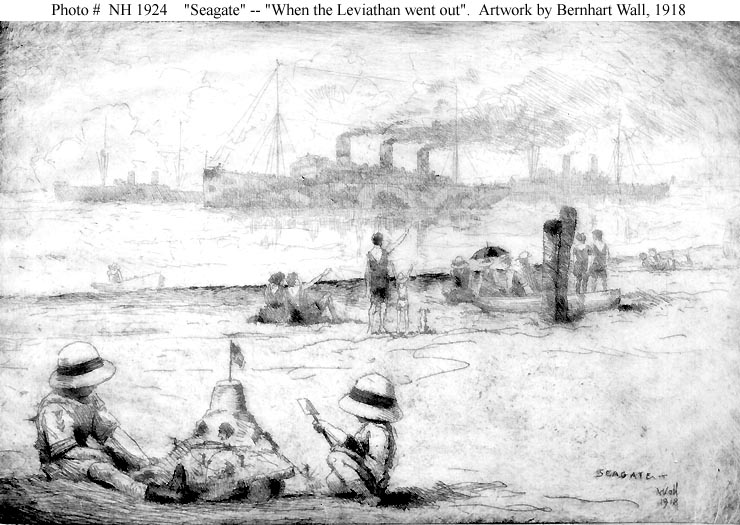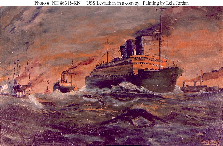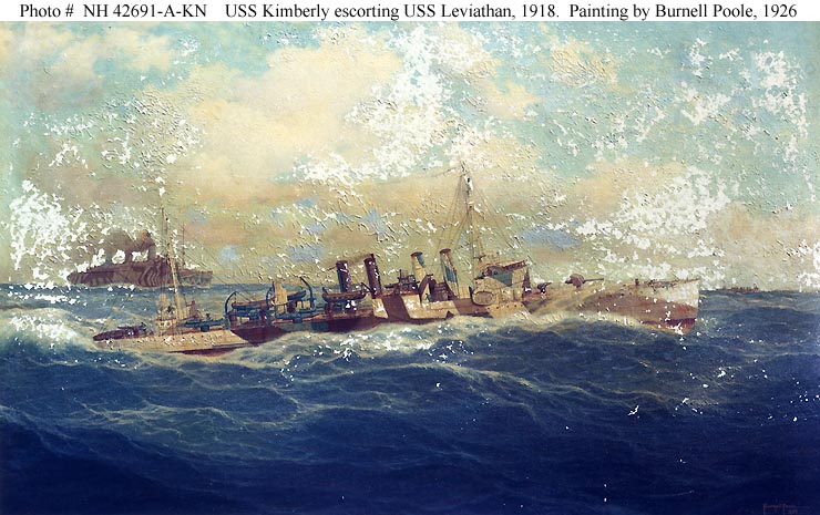 Photo #: NH 42690-KN "A Fast Convoy" Oil painting by Burnell Poole, depicting USS Allen (Destroyer # 66) escorting USS Leviathan (ID # 1326) in the War Zone, 1918. The original painting measures 60" x 33". Courtesy of the Naval Historical Foundation, Washington, D.C. U.S. Naval Historical Center Photograph. Online Image: 50KB; 740 x 420 pixels Note: See Photo # NH 42690-KN (extended caption) for the artist's comments on this painting. |