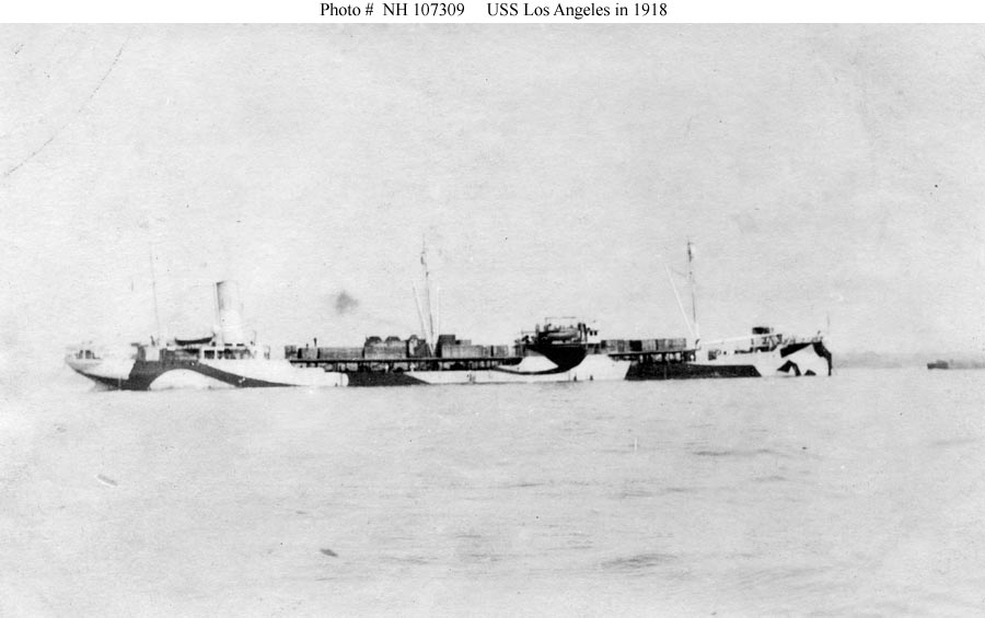 Photo #: NH 107309 USS Los Angeles (ID # 1470) At anchor, circa 1918, with her deck loaded with cargo crates. She is painted in pattern camouflage. The original photograph is printed on post card ("AZO") stock. Donation of Dr. Mark Kulikowski, 2010. U.S. Naval History and Heritage Command Photograph. Online Image: 53 KB; 900 x 565 pixels |