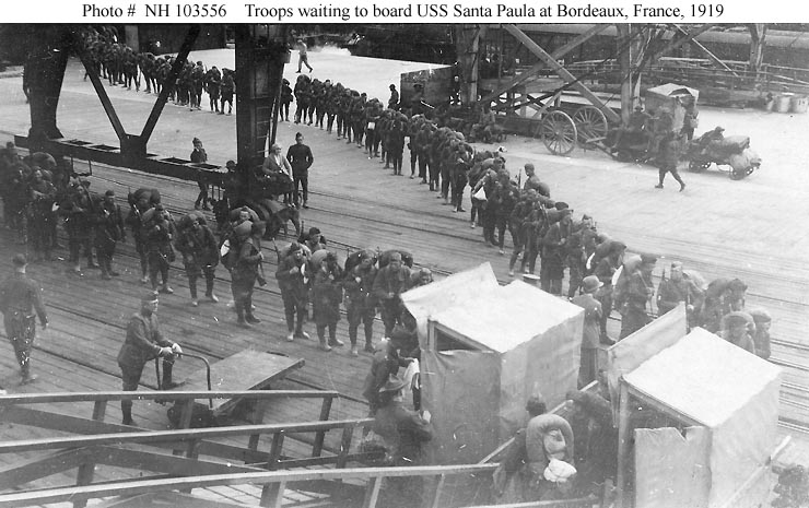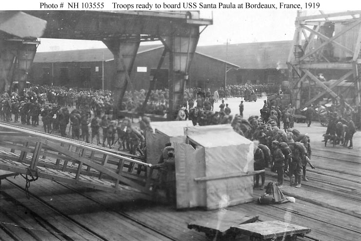 Troops ready to come aboard the ship at Bordeaux, France, for