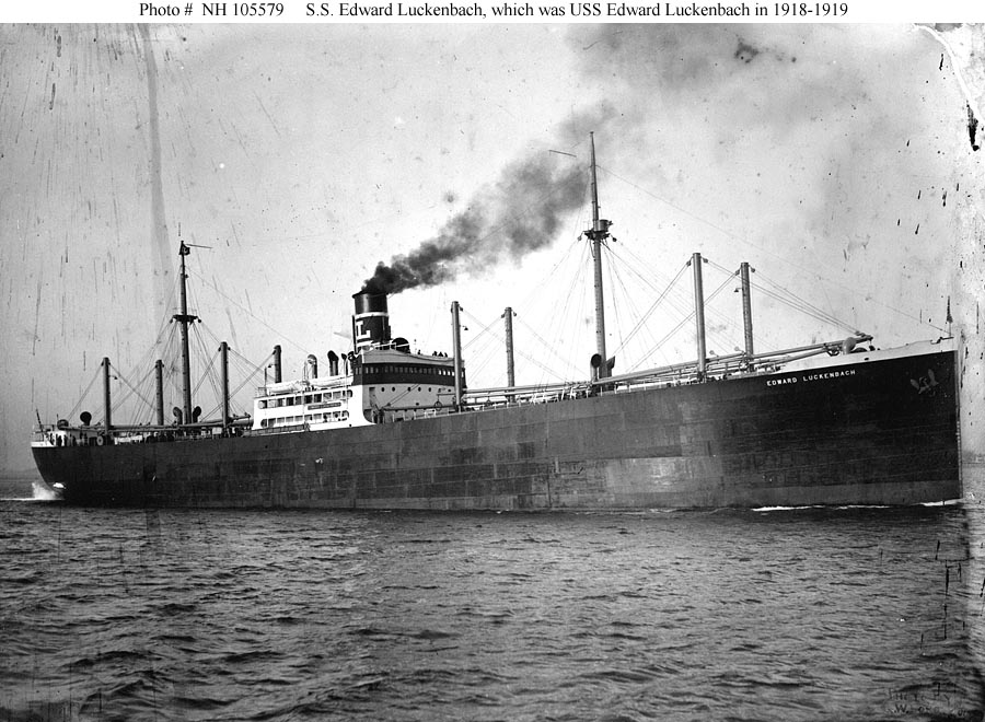 S.S. Edward Luckenbach, an 8151 gross ton (15,963 tons displacement) freighter, was built at Quincy, Massachusetts, in 1916 for commercial operation by the Luckenbach Steamship Company of New York City. She was transferred to the Navy in late August 1918 and placed in commission at that time as USS Edward Luckenbach (ID # 1662). In mid-September, as a unit of the Naval Overseas Transportation Service, the ship began a voyage to France with Army cargo. Upon her return to the U.S. in November 1918, soon after the Armistice brought World War I's fighting to an end, Edward Luckenbach was converted to a troop transport. Reassigned to the Cruiser and Transport Force, during the first eight months of 1919 she made three voyages to bring home veterans of the great conflict. A fourth trip for this purpose was aborted by problems with her machinery. USS Edward Luckenbach was decommissioned in early August 1919 and returned to her owner. Following more than two decades of further merchant marine service, on 1 July 1942 she sank after accidently entering a defensive minefield off Florida and striking two mines.