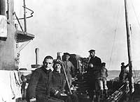 Photo #: NH 2472 U-152 (German Submarine, 1917) View on deck during a combat cruise in the Atlantic, 16 October 1918. Seated in the left center foreground are two U.S. Navy officers captured when the submarine sank USS Ticonderoga (ID # 1958) on 30 September 1918. They are Lieutenant Frank L. Muller, USNRF, Ticonderoga's Executive Officer (at left), and Lieutenant (Junior Grade) Junius H. Fulcher, USNRF. The others present are members of U-152's crew. U.S. Naval Historical Center Photograph. Online Image: 67KB; 740 x 570 pixels |