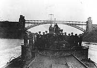 Photo #: NH 41767 U-152 (German Submarine, 1917) Officers, crewmen and a former prisoner of war on the submarine's foredeck, while she was passing through the Kiel Canal on the way to Harwich, England to be surrendered, 28 November 1918. Two U.S. Navy officers, captured when the U-152 sank USS Ticonderoga (ID # 1958) on 30 September 1918, were on board the submarine. One is seen in this photograph, standing third from right, wearing his uniform and a civilian cap. He is Lieutenant Frank L. Muller, USNRF, Ticonderoga's Executive Officer. The other was Lieutenant (Junior Grade) Junius H. Fulcher, USNRF. U.S. Naval Historical Center Photograph. Online Image: 69KB; 740 x 545 pixels |