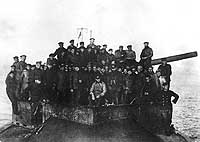 Photo #: NH 44371 U-152 (German Submarine, 1917) Officers, crewmen and their U.S. Navy prisoners of war on the submarine's deck, as she arrived at Kiel, Germany, 15 November 1918. The two U.S. Navy officers, captured when the U-152 sank USS Ticonderoga (ID # 1958) on 30 September 1918, are in the left portion of this photograph. Lieutenant (Junior Grade) Junius H. Fulcher, USNRF, is wearing his USN Officer's cap, and stands directly behind the bearded man in the left foreground. By his left shoulder, wearing a civilian cap, is Lieutenant Frank L. Muller, USNRF, Ticonderoga's Executive Officer. U.S. Naval Historical Center Photograph. Online Image: 75KB; 740 x 550 pixels |