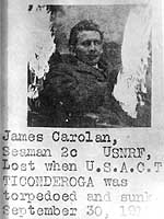 Photo #: NH 50616 Seaman Second Class James Carolan, USNRF Who lost his life when USS Ticonderoga (ID # 1958) was sunk in combat with the German submarine U-152, 30 September 1918. U.S. Naval Historical Center Photograph. Online Image: 81KB; 555 x 765 pixels |