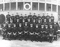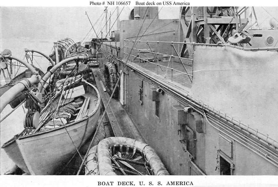 Halftone reproduction of a photograph looking aft along the starboard side of the ship's boat deck, circa 1919.
