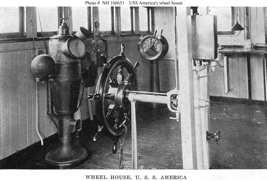 Halftone reproduction of a photograph taken inside the ship's wheel house, circa 1919, showing her binnacle, steering wheel and an engine order telegraph.