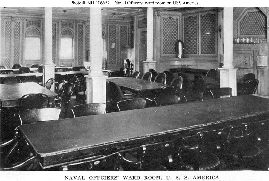 Halftone reproduction of a photograph of the ship's Naval officers' ward room, circa 1919.