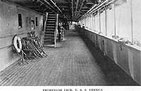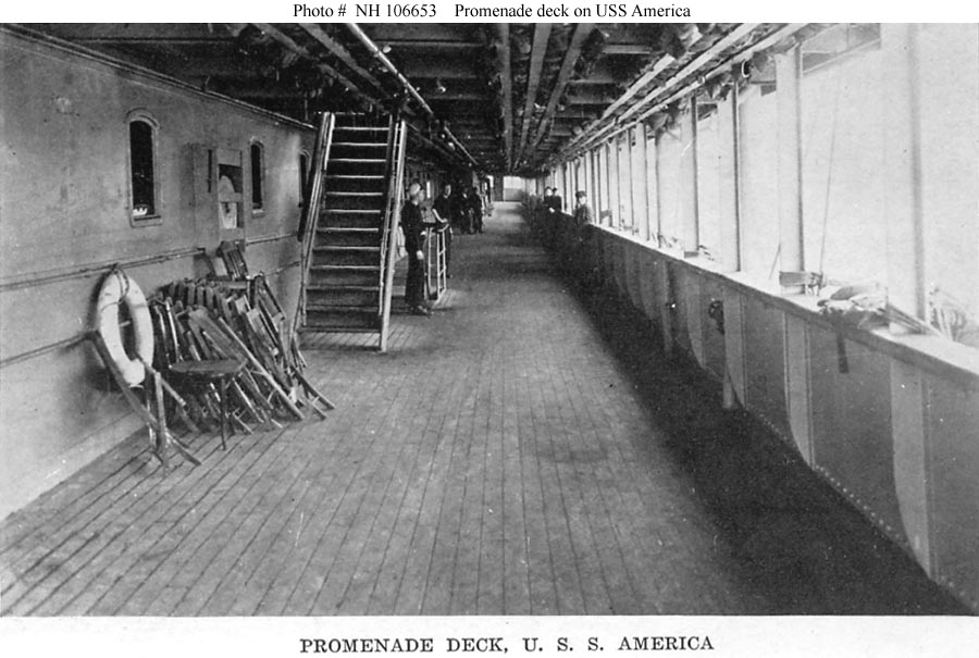 Halftone reproduction of a photograph looking along the ship's promenade deck, circa 1919.