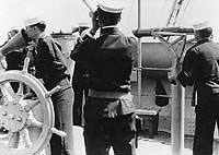 Photo #: NH 54660 USS DeKalb (ID # 3010) Scene on the ship's fire control bridge, 18 May 1918. Note man at speaking tube at left, officer with binoculars in the center, and telescope at right. U.S. Naval Historical Center Photograph. Online Image: 103KB; 740 x 550 pixels |