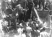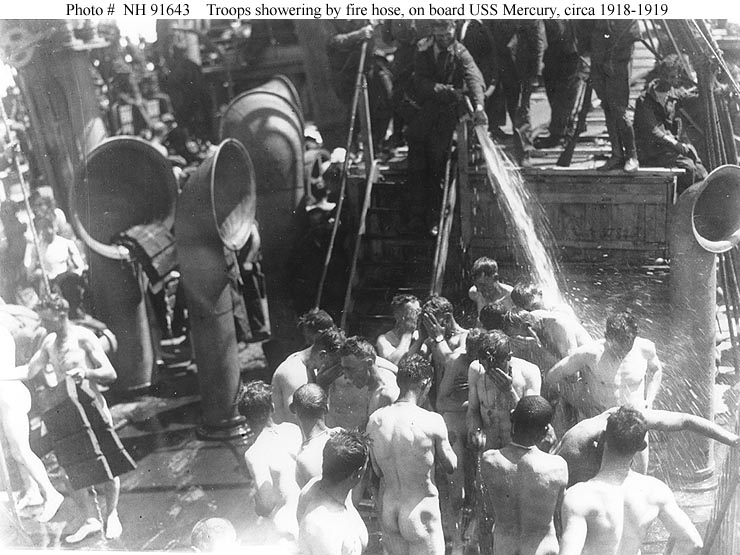 Troops receive a firehose showerbath on board, circa 1918-1919.