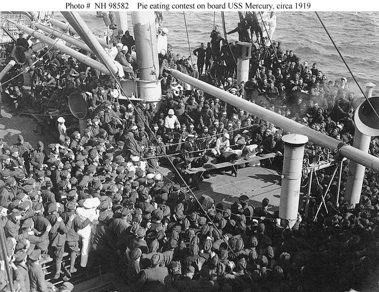Pie eating contest during a recreation session held for embarked