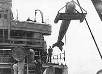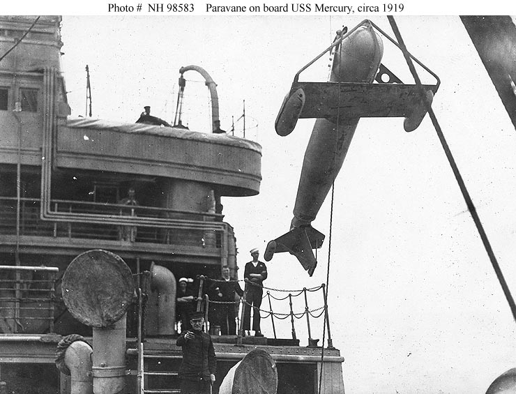 Hoisting a paravane from the ship's foredeck, circa 1919.