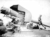 Six-inch gun mounted aft on the ship, with Sailors and Soldiers relaxing nearby, circa 1918-1919.