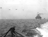 Note the destroyer's after torpedo tubes and wake. Despite being