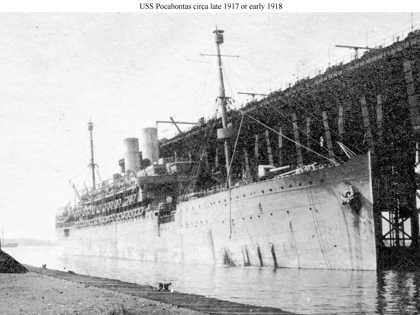 With other interned German ships, she was seized when the United States entered the conflict in April 1917 and turned over the the Navy. In late July, while refitting at the New York Navy Yard, the ship was placed in commission as USS Prinzess Irene (sometimes spelled Princess Irene). Renamed Pocahontas at the beginning of September, and later assigned Navy registry ID # 3044, she made her initial voyage as a Navy troop transport during September and October 1917, steaming from New York to St. Nazaire, France, and back. Eight more round-trips trips between the U.S. and France followed before the fighting ended in November 1918. In all, Pocahontas carried more than 24,000 service personnel to the combat zone. During her wartime service, she had one notable encounter with the enemy, a running gun battle with a German submarine on 2 May 1918 that produced no damage to either side.