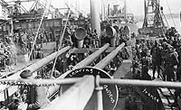 The ship's upper deck is crowded with troops, indicating that