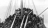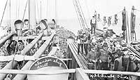 Note lifeboats at right and homeward bound troops on deck.