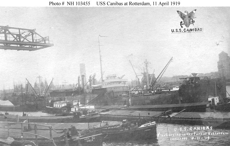 Canibas, a 6846 gross ton (13,910-tons displacement) civilian freighter, was built in 1918 at Bath, Maine, for the United States Shipping Board. Transferred to the Navy in September 1918, she was immediately placed in commission as USS Canibas (ID # 3401) and assigned to the Naval Overseas Transportation Service. Between late September 1918 and late May 1919 the ship completed three round-trip voyages between the East Coast and European ports, carrying cargo to support U.S. forces overseas. Canibas was decommissioned at Brooklyn, New York, in early June 1919 and returned to the Shipping Board.