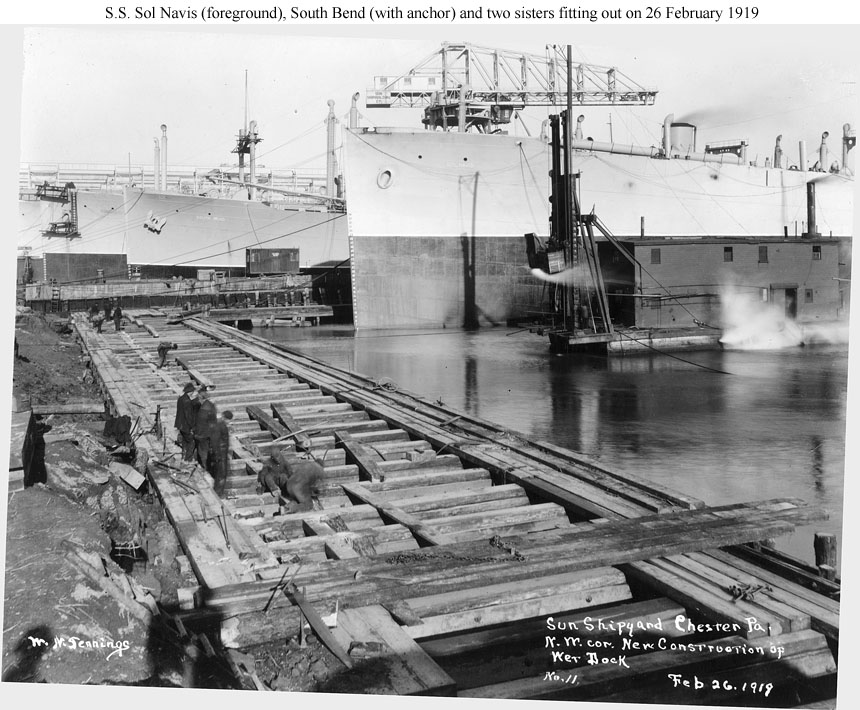 Photo #: None S.S. South Bend and Sol Navis (American freighters, 1919) Fitting out on 26 February 1919 in the wet dock at the Sun Shipyard, Chester, Pa. South Bend is on the left nearly complete and Sol Navis is on the right. Source: U.S. National Archives, RG-32-UB. |