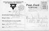 Photo #: NH 105175 YMCA Postal Card for Returning Troops, 1919 Reverse side of a card used by returning troops to report their arrival home from Europe. This example was sent on 27 September 1919, reporting the arrival of Joe Whalen in USS Sol Navis (ID # 4031-A). The front side of this card is identical to that seen in Photo # NH 103458. Donation of Dr. Mark Kulikowski, 2007. U.S. Naval Historical Center Photograph. Online Image: 78KB; 740 x 490 pixels |