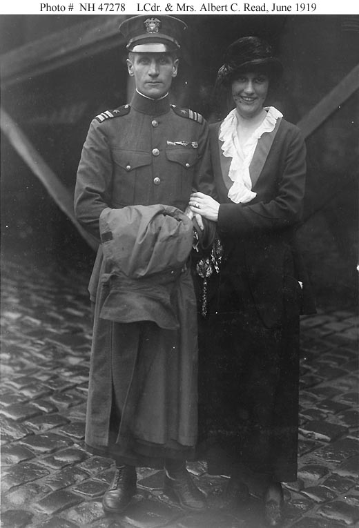 Photo #: NH 47278 Lieutenant Commander Albert C. Read, USN, Commander of the seaplane NC-4 With Mrs. Read at Hoboken, New Jersey, on 28 June 1919, just after he had stepped ashore from USS Zeppelin, which had brought the crews of the NC flying boats home from Europe to receive a royal welcome in New York City. U.S. Naval Historical Center Photograph. Online Image: 56KB; 520 x 765 pixels |