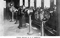 Photo #: NH 103321 USS Zeppelin (ID # 4042) Halftone reproduction of a photograph taken in 1919, showing the interior of the ship's wheel house. Note the German-language labels on the engine order telegraph. This image is one of ten photographs published in a "Souvenir Folder" of views concerning USS Zeppelin. Donation of Dr. Mark Kulikowski, 2005. U.S. Naval Historical Center Photograph. Online Image: 80KB; 740 x 495 pixels |