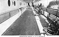 Photo #: NH 103324 USS Zeppelin (ID # 4042) Halftone reproduction of a photograph taken in 1919, showing the ship's promenade deck. Note the life rafts hung outboard of the railings, and the lines attached to the rafts. This image is one of ten photographs published in a "Souvenir Folder" of views concerning USS Zeppelin. Donation of Dr. Mark Kulikowski, 2005. U.S. Naval Historical Center Photograph. Online Image: 96KB; 740 x 490 pixels |