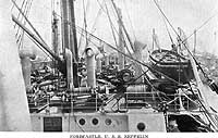 Photo #: NH 103327 USS Zeppelin (ID # 4042) Halftone reproduction of a photograph taken in 1919, looking forward over the ship's foredeck. Note lifeboat, davits and ventilators. This image is one of ten photographs published in a "Souvenir Folder" of views concerning USS Zeppelin. Donation of Dr. Mark Kulikowski, 2005. U.S. Naval Historical Center Photograph. Online Image: 100KB; 740 x 495 pixels |
