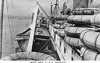 Photo #: NH 103328 USS Zeppelin (ID # 4042) Halftone reproduction of a photograph taken in 1919, looking aft along the ship's boat deck. Note lifeboats and life rafts. This image is one of ten photographs published in a "Souvenir Folder" of views concerning USS Zeppelin. Donation of Dr. Mark Kulikowski, 2005. U.S. Naval Historical Center Photograph. Online Image: 97KB; 740 x 490 pixels |