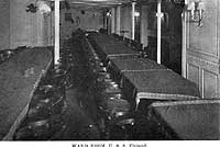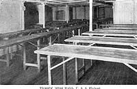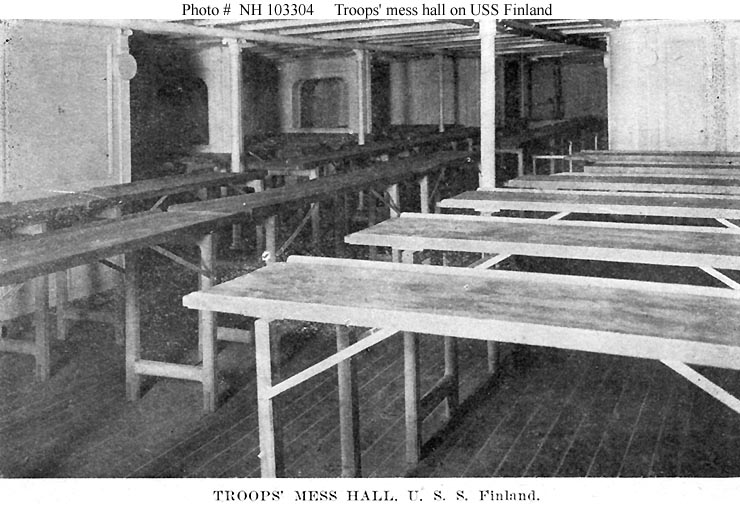 Photo #: NH 103304 USS Finland (ID # 4543) Halftone reproduction of a photograph taken circa 1918-1919, showing a troops' mess hall on board the ship. Note the tall tables, at which troops ate standing up. This image is one of ten photographs published circa 1918-1919 in a "Souvenir Folder" of views concerning USS Finland. Donation of Dr. Mark Kulikowski, 2005. U.S. Naval Historical Center Photograph. Online Image: 86KB; 740 x 505 pixels |