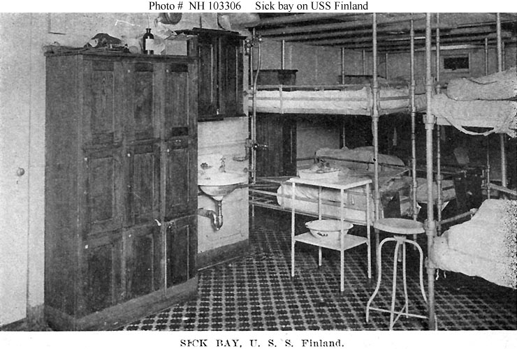 Photo #: NH 103306 USS Finland (ID # 4543) Halftone reproduction of a photograph taken circa 1918-1919, showing the ship's sick bay. This image is one of ten photographs published circa 1918-1919 in a "Souvenir Folder" of views concerning USS Finland. Donation of Dr. Mark Kulikowski, 2005. U.S. Naval Historical Center Photograph. Online Image: 92KB; 740 x 500 pixels |