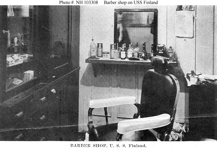 Photo #: NH 103308 USS Finland (ID # 4543) Halftone reproduction of a photograph taken circa 1918-1919, showing the ship's barber shop. This image is one of ten photographs published circa 1918-1919 in a "Souvenir Folder" of views concerning USS Finland. Donation of Dr. Mark Kulikowski, 2005. U.S. Naval Historical Center Photograph. Online Image: 82KB; 740 x 505 pixels |