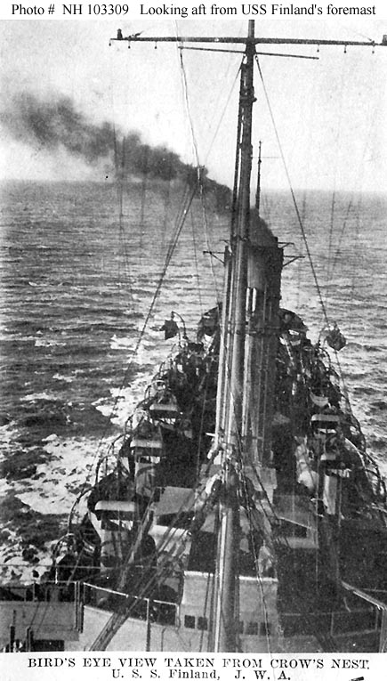 Photo #: NH 103309 USS Finland (ID # 4543) Halftone reproduction of a photograph taken circa 1918-1919, looking aft from the ship's foremast crows' nest, while she was underway at sea. This image is one of ten photographs published circa 1918-1919 in a "Souvenir Folder" of views concerning USS Finland. Donation of Dr. Mark Kulikowski, 2005. U.S. Naval Historical Center Photograph. Online Image: 93KB; 435 x 765 pixels |