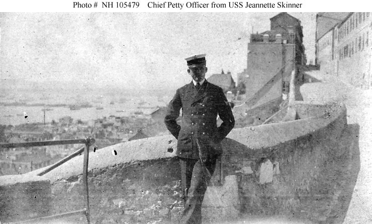 The freighter was commandeered by the U.S. Shipping Board in August 1917 and was commissioned in the Navy on 12 April 1918 as USS Jeannette Skinner (ID # 1321). After loading a cargo of general supplies at Baltimore, Maryland, she sailed from New York in May with a convoy for Brest, France. Returning to New York in June, Jeannette Skinner loaded another Army cargo at Baltimore and delivered it at Brest and Bordeaux, France, in August. Her third eastbound voyage took her from New York to La Pallice and Bordeaux in September and October. While in the Gironde River, France, on 27 November 1918, she was damaged in collision with the Japanese steamer Ceylon Maru. During her return voyage in December the ship had to put in to Bermuda for fuel and, upon arrival at Baltimore, entered drydock to begin two months of repairs. In March and April 1919 Jeannette Skinner carried a cargo of wheat, oats, and lard to Cette, France, via Gibraltar on behalf of the Southern Food Administration. Once again she had to refuel on her homeward voyage, this time in the Azores. USS Jeannette Skinner was decommissioned at Baltimore on 10 June 1919 and was returned to the Shipping Board.