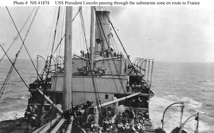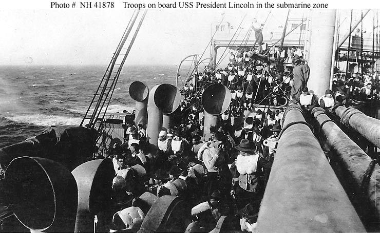 Photo #: NH 41874 USS President Lincoln (1917-1918) Scene on board the ship, looking forward from her after superstructure, as she passed through the submarine zone en route to France with Soldiers of the 42nd (Rainbow) Division on board, circa October 1917. Note troops on deck, wearing life jackets. A band appears to be playing in the lower right center. Courtesy of the Naval Historical Foundation, Washington, D.C. - USS President Lincoln Collection. U.S. Naval Historical Center Photograph. Online Image: 72KB; 740 x 460 pixels |