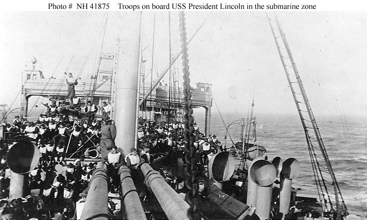 Photo #: NH 41875 USS President Lincoln (1917-1918) Troops on deck, wearing life jackets, as the transport passed through the submarine zone en route to France. A hand-written inscription on the reverse of the original print dates this photo in October 1917 and identifies the troops as part of the Rainbow Division. View looks aft from the ship's forecastle. U.S. Naval Historical Center Photograph. Online Image: 82KB; 740 x 445 pixels |