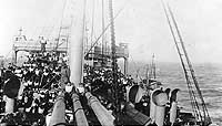 Photo #: NH 41878 USS President Lincoln (1917-1918) Troops on deck, wearing life jackets, as the transport passed through the submarine zone en route to France. A hand-written inscription on the reverse of the original print for Photo # NH 41875 (taken at the same time as this one) dates this photo in October 1917 and identifies the troops as part of the Rainbow Division. View looks aft from the ship's forecastle. U.S. Naval Historical Center Photograph. Online Image: 98KB; 740 x 455 pixels |