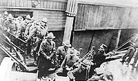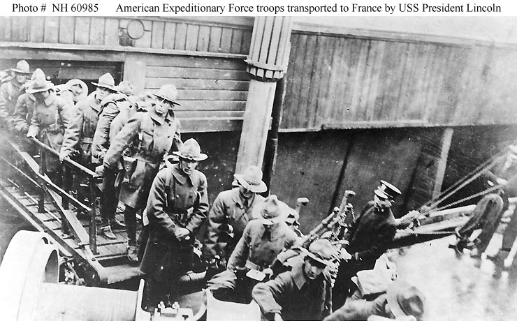 Photo #: NH 60985 USS President Lincoln (1917-1918) Troops of the American Expeditionary Force boarding the ship at Hoboken, New Jersey, circa 1917-1918. Courtesy of the Naval Historical Foundation, Washington, D.C. - USS President Lincoln Collection. U.S. Naval Historical Center Photograph. Online Image: 97KB; 740 x 460 pixels |
